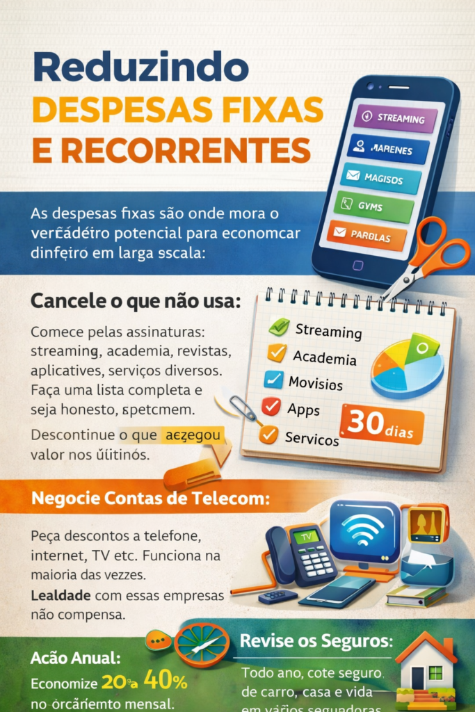 As despesas fixas são onde mora o verdadeiro potencial para economizar dinheiro em larga escala. Uma redução de R$ 100 em uma despesa fixa economiza R$ 1.200 por ano automaticamente, sem esforço contínuo. Comece pelas assinaturas: streaming, academia, revistas, aplicativos, serviços diversos. Faça uma lista completa e seja honesto sobre o que você realmente usa. Cancele tudo que não agregou valor nos últimos 30 dias. Você pode sempre reassinar depois se sentir falta – mas provavelmente não vai sentir.